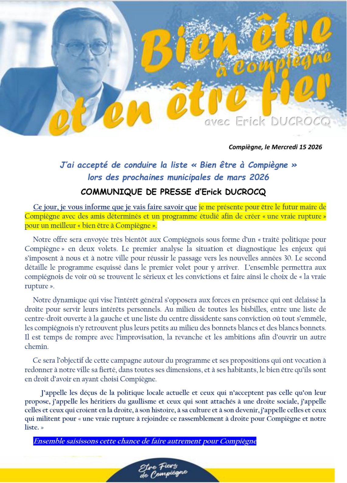 Le 15 mars, votez et faites voter la droite à Compiègne. Votez la liste « Bien être à Compiègne et en être fiers ! », qui est plus qu’un slogan mais une nouvelle politique.